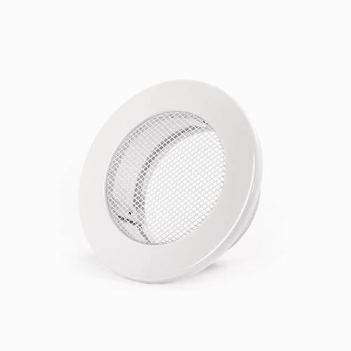Rejilla redonda sin compuerta, metálica para salida de aire caliente, en color blanco.